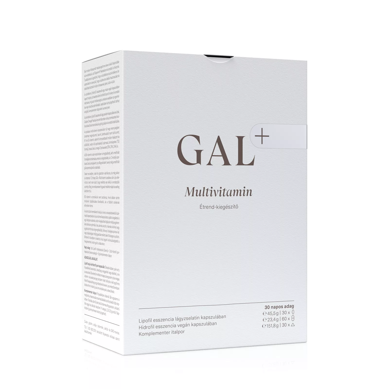 A GAL+ Multivitamin termékünket a legújabb kutatások fényében fejlesztettük ki, szem előtt tartva a természetességet és életszerűséget, hogy minden vitamint, ásványianyagot, nyomelemet ideális formában, mennyiségben és arányban tartalmazzon, nem eltérve attól, ahogyan ezekhez állandó tápanyagdús, változatos táplálkozással juthatnánk. Ahol előnyös, a vitaminok és ásványok részben organikus termesztésből származó (bio) gyógy- és fűszernövények kivonatából származnak. A mennyiségek esetében végig fontosnak tartottuk, hogy a napi adag biztosan tartalmazza a hatásosnak talált dózist, de semmi esetre se lépje túl az életszerű mennyiségeket, azaz azt a mennyiséget, amit táplálkozással már nem is lehetne fedezni sehogyan sem. Emellett rendkívül fontos, hogy a gondosan válogatott alapanyagok mellett ne lábatlankodjék semmi, ami nem odavaló. A termékünkben ilyesminek nyomát sem találja.